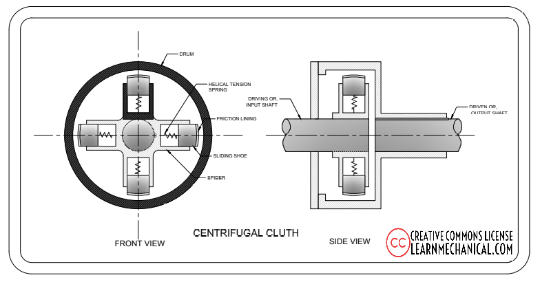 The Centrifugal force can also be used to push the sliding shoes outward. Then the friction lining of the shoes makes a connection with the drum’s inner surface. So, the drum starts to move. The drum is then attached to the driven shaft. At first, it helps to transmit the power to the transmission shaft from the engine shaft and then to the load.